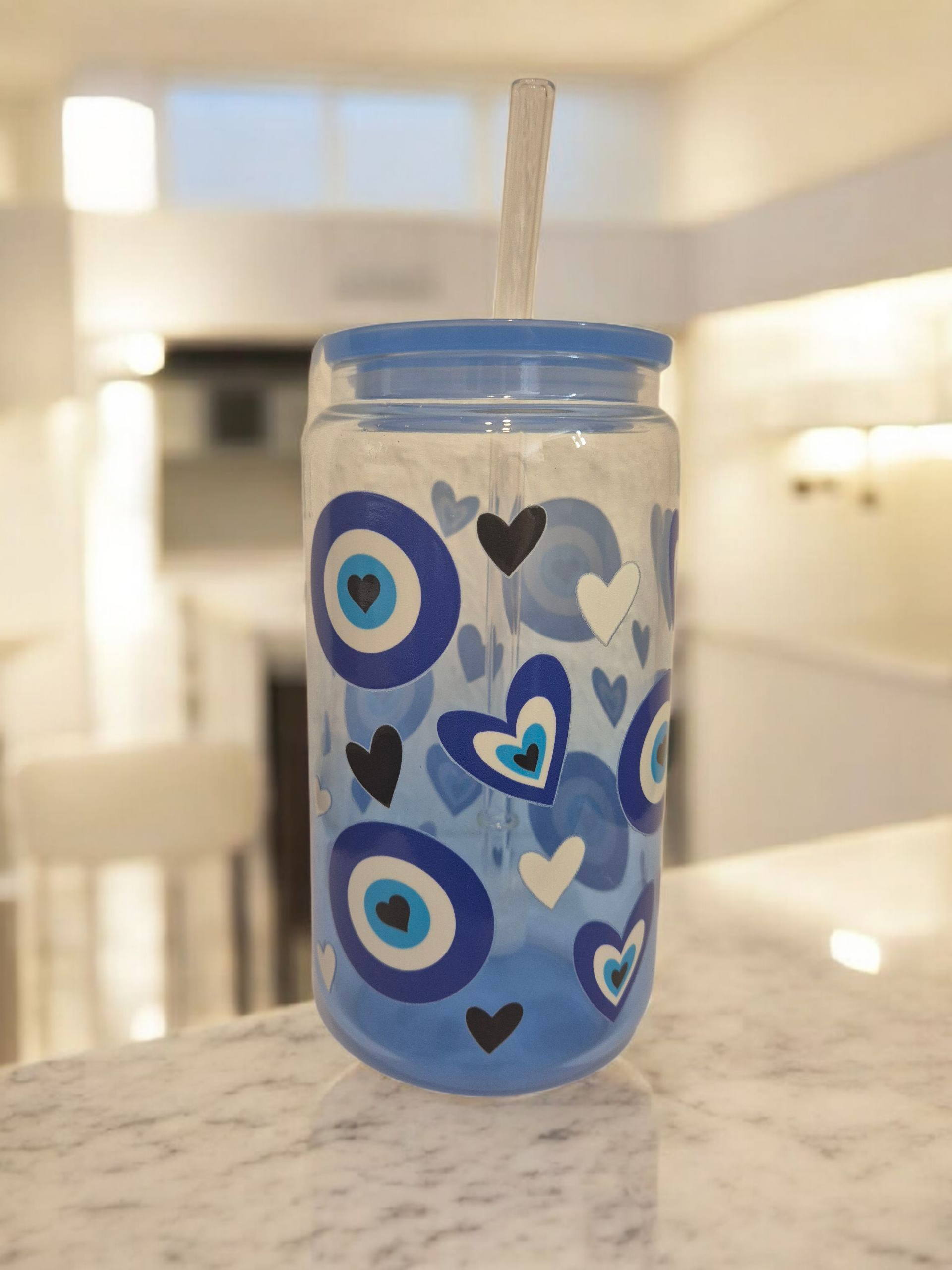 Verleihen Sie Ihrem Trinkvergnügen eine persönliche Note mit meinem einzigartigen Glasbecher mit Deckel und Strohhalm. In einem ansprechenden Blau gehalten, besticht dieses Trinkglas durch ein charmantes Türkisches Auge Motiv, das sowohl Jugendliche als auch Erwachsene begeistern wird. Mit einer Kapazität von 0,5 Litern ist es der ideale Begleiter für alle Arten von Getränken.